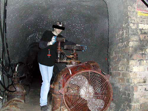 Captain Nordic PRETENDS to try to turn some big gears protruding from a water main.