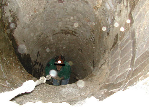 Slim Jim descending our awesome knotted rope down a 30 foot shaft. It was tied to a rusty iron pipe, wedged across the opening.