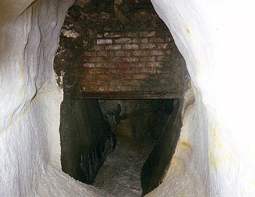 One of the several side-drifts that were bisected by a tunnel running parallel and slightly above the main sewer. The brick wall is the outside wall of a different tunnel.