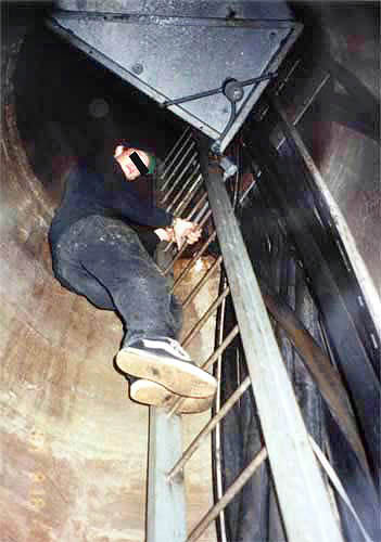 Dag Jefferson climbing a series of five staggered 20-foot ladders.