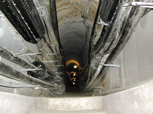 A nice shot up from a stairwell into a tunnel with phone cables on each side.