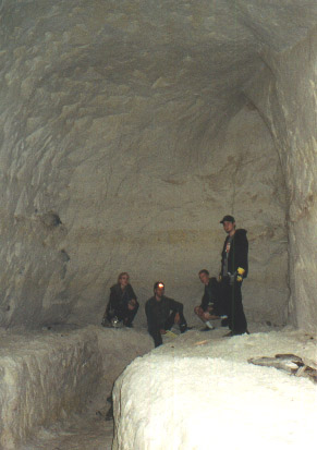 We next headed to the tunnel with the canvas doorway; it wound around for quite awhile before ending in an apparent cave-in. So, it was back to the main tunnel (with the water pipe in it). We moved in deeper, and soon found ourselves in a labyrinth of huge tunnels carved out of the naked sandstone. Some had ceilings at least 40 feet high, and none was smaller than 15 feet.