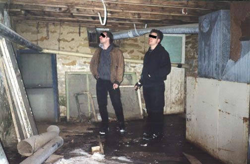 Rebel and Fuck exploring an ice and mud-filled basement of a vacated house at the edge of some woods.