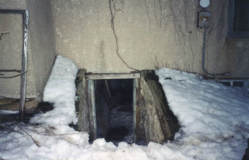 The entrance to a old-fashioned cellar under an abandoned house in the woods.