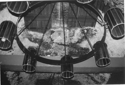 A chandelier hangs from the decaying ceiling of the Rathskeller.