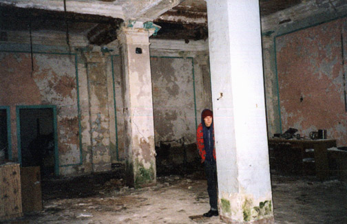 Urban Waste peers around a pillar in the lobby, watching out the fron windows for anyone noticing us.