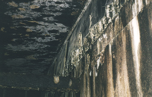 shit-stained ceiling at left, streaked, shit-stained wall at right,