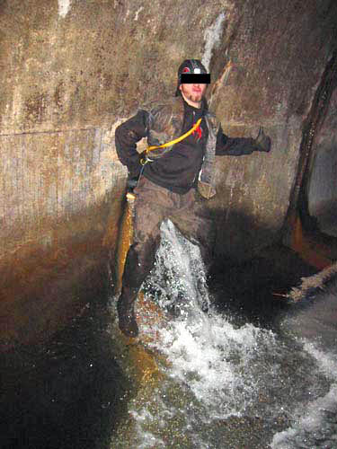 Max Action takes a leak. No, he is not pregnant. That is his camera down his shirt.
