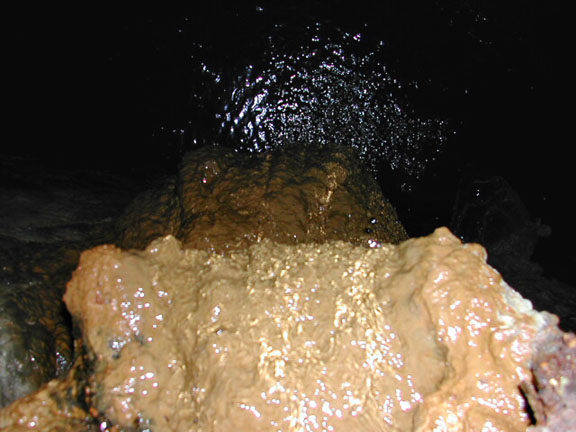 Looking down a waterfall into a flooded tunnel. That's rock-hard mineral deposit, not mud.