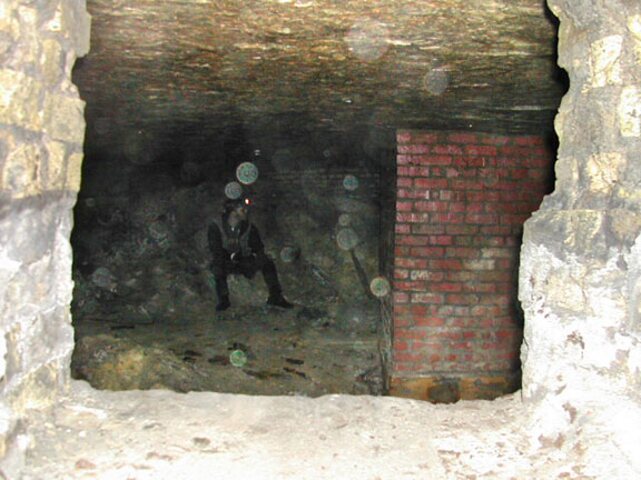 Max resting on a pile of rubble in a part of the largest cavern associated with the tailraces: the City Waterworks Cave.