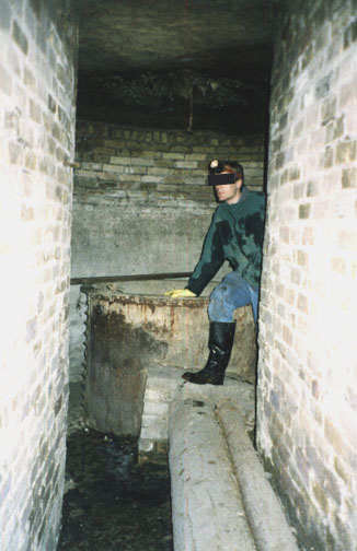 Jim in a circular room with an ancient pipe going downward in the middle.