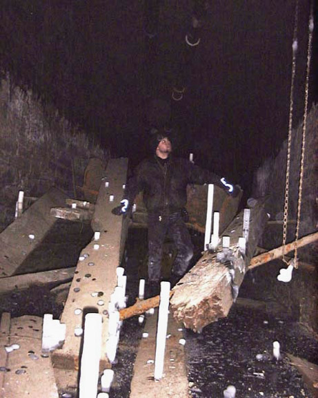 Max amidst boards, pipes, chains, and ice formations.