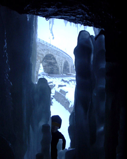Peter peering into the frozen waterfall, with the Stone Arch Bridge in the background.