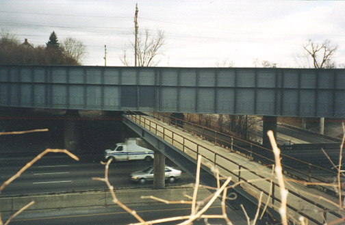 From the south, the view shows the bridge terminating in the blank wall of the railroad bridge.