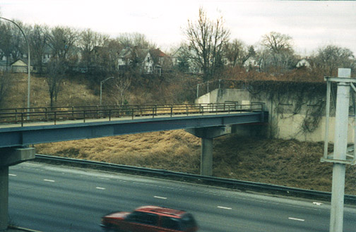 From the north, the view shows the bridge terminating in a blank cement wall, with no way up or down.